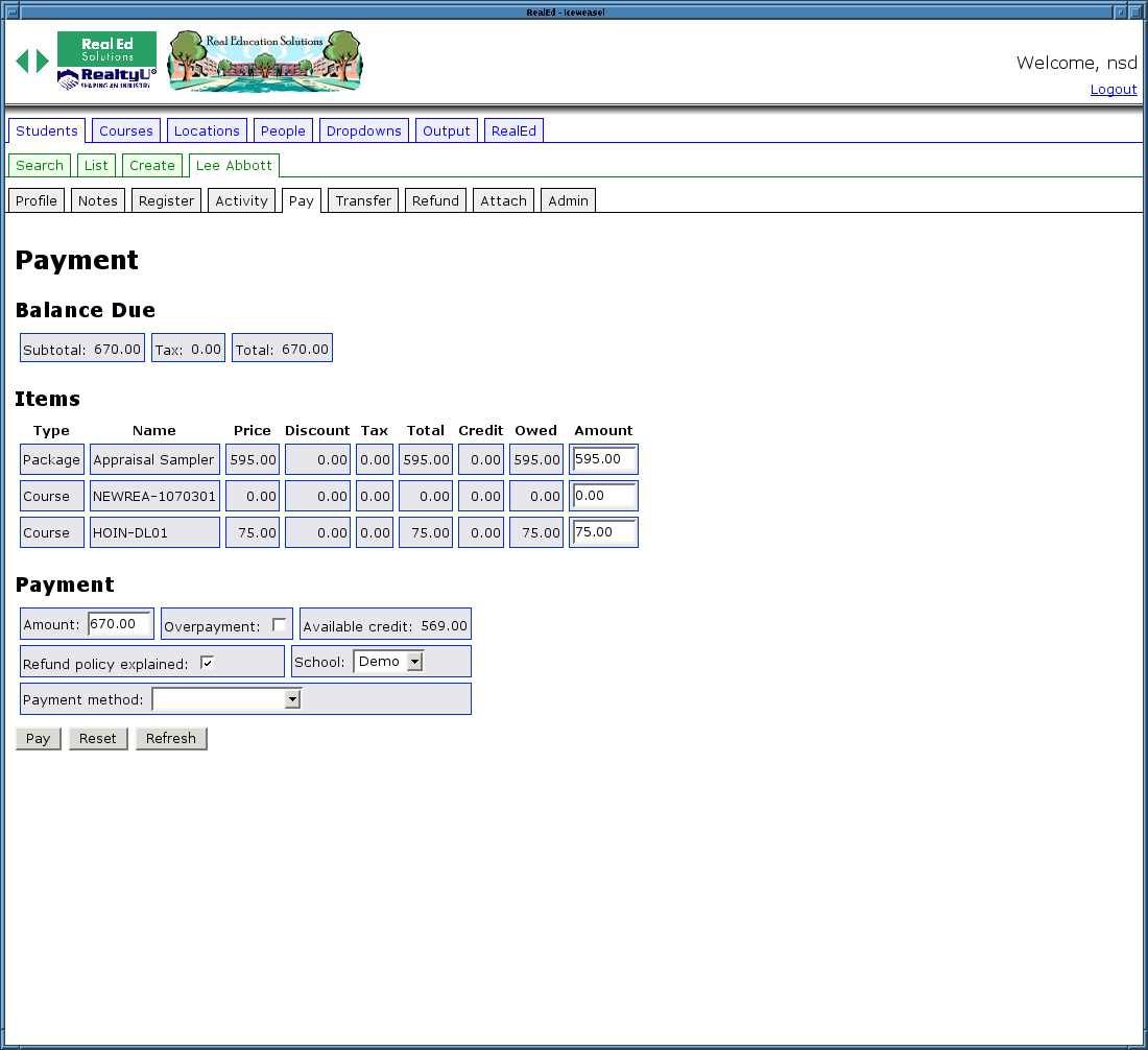 The payment interface allows partial or full payment toward any combination of items from accumulated shopping carts.