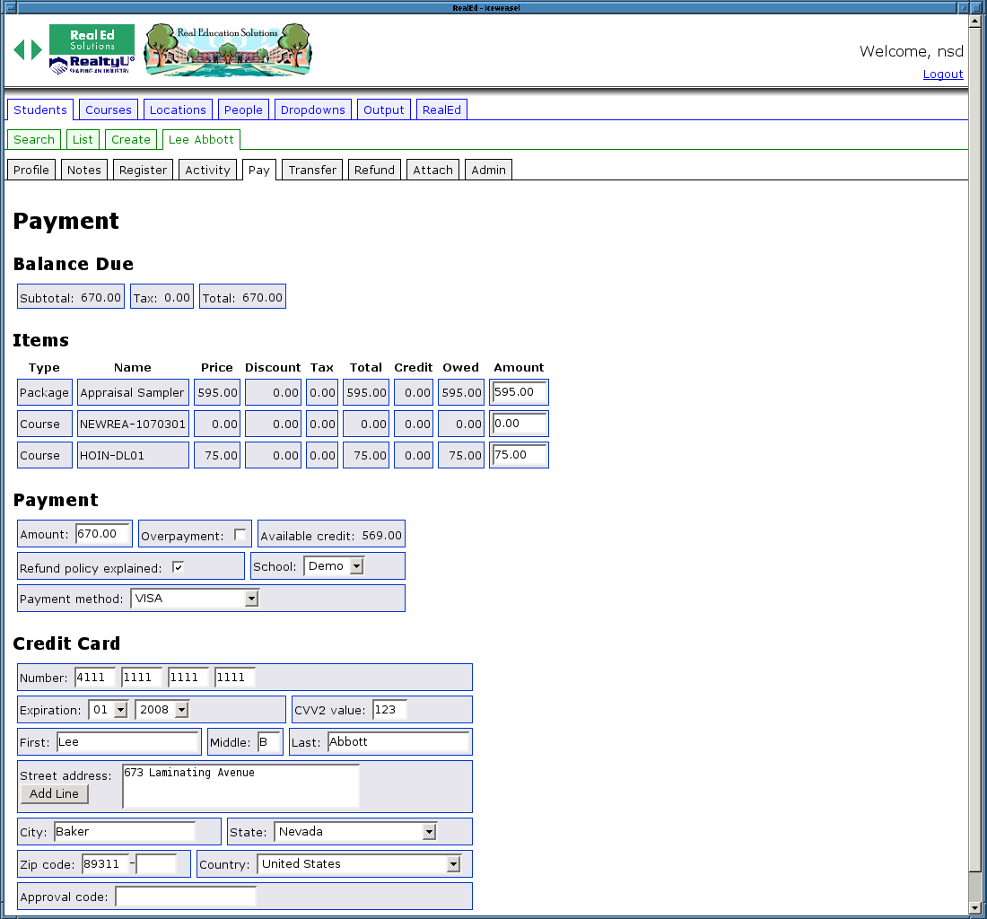 When a payment method is selected, the interface dynamically expands to display applicable payment input fields. As with most dropdowns, payment methods are user-definable within the RealEd interface.